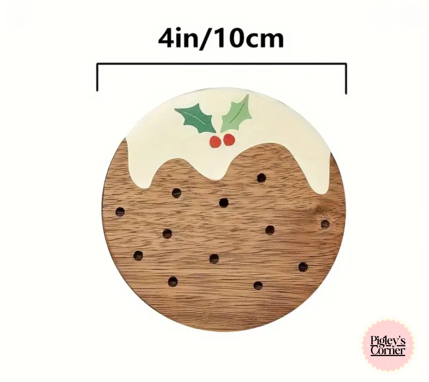 Christmas Pudding Wooden Coasters – Festive Holiday Drink Mats (Set of 4) | Pigley’s Corner